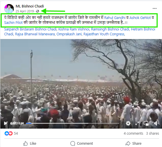 Taking a clue, we looked up keywords “रामसीन” and “कांग्रेस” on Facebook, and set the time period of the search to 2019. This yielded a post by @mangilalvishnoi043, dated April 25, 2019. Carrying the viral video, the post stated that the visuals are from a Congress rally in Jalore’s Ramseen.