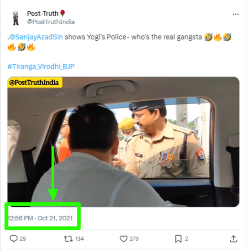 Following this, we skimmed through the X account of user @PostTruthIndia, and found that the video was first shared on October 21, 2021. The caption of the same stated, “@SanjayAzadSln shows Yogi’s Police- who’s the real gangsta …#Tiranga_Virodhi_BJP”