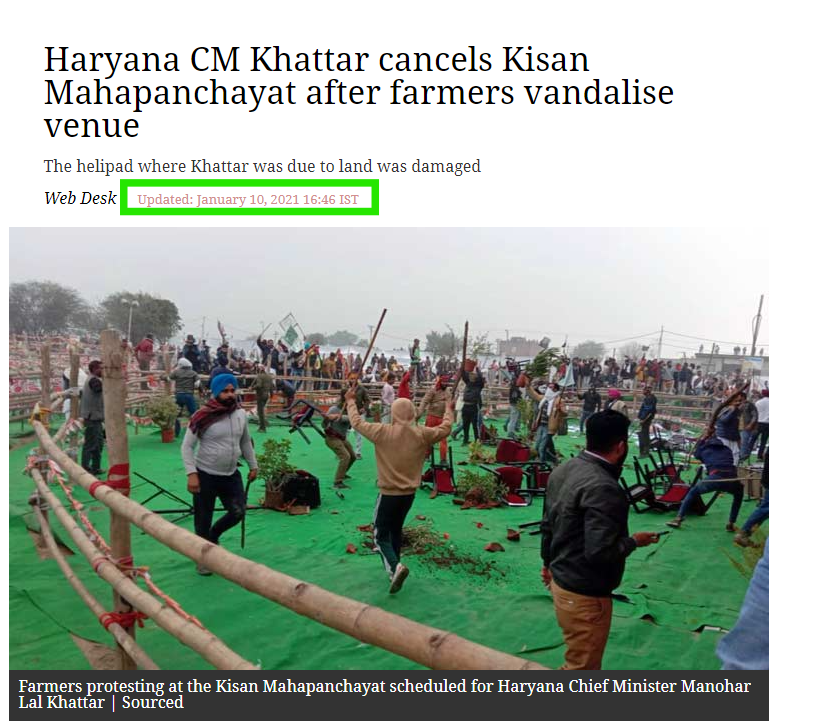 Taking a clue, we looked up “Kisan Mahapanchayat,” “stage, and “vandalised” on Google which led us to a report by The Week, dated January 10, 2021. Displaying images similar to the visuals seen in the viral footage, the report stated, “Haryana Chief Minister Manohar Lal Khattar has cancelled his ‘Kisan Mahapanchayat’ visit to Kaimla village, Karnal, after farmers protesting against the three farm bills vandalised the venue. “