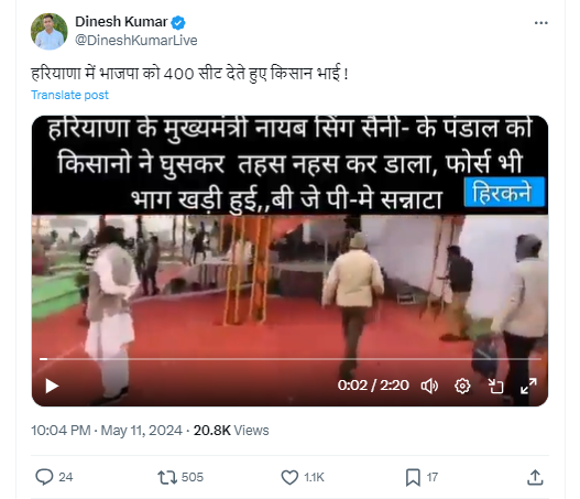 Multiple X users shared the video amid the Lok Sabha Elections stating“Farmers giving 400 seats to the BJP in Haryana. (translated from Hindi)”