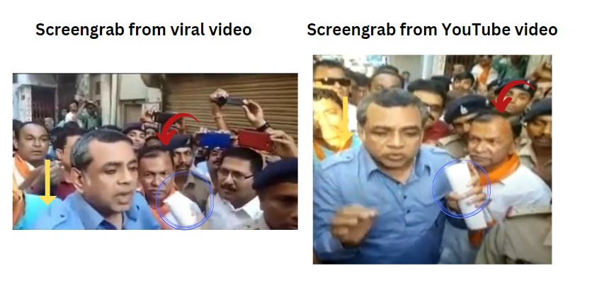 Around 30 seconds into the video, we spotted visuals of Rawal gheraoed by a crowd demanding an apology. On comparing the keyframes of the YouTube video with the viral footage, we found them to be from the same incident.