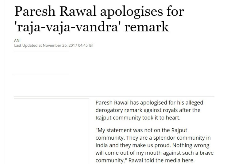 In a report, dated November 26, 2017, Business Standard stated, “Paresh Rawal has apologised for his alleged derogatory remark against royals after the Rajput community took it to heart. “My statement was not on the Rajput community. They are a splendor community in India and they make us proud. Nothing wrong will come out of my mouth against such a brave community,” Rawal told the media here. The actor-turned-politician, while remembering Sardar Patel at a recent rally in Rajkot, had compared the royals and music to monkeys, which did not go down well with the said community (sic).“