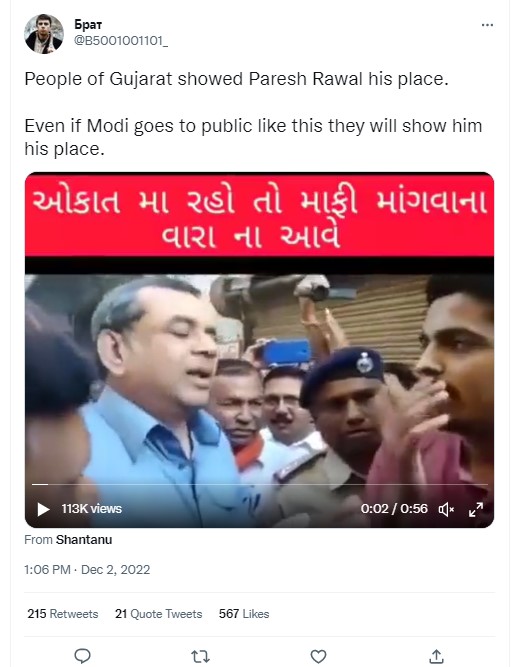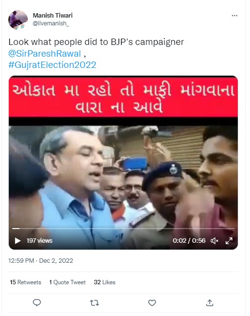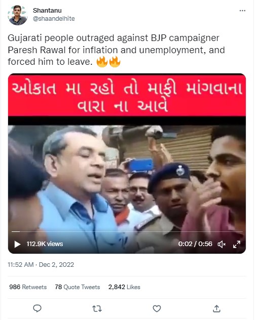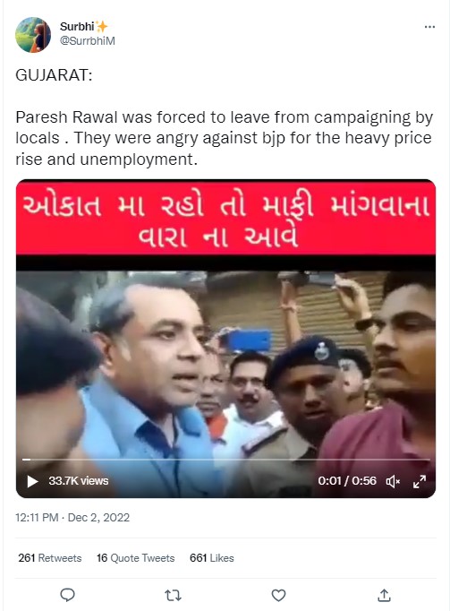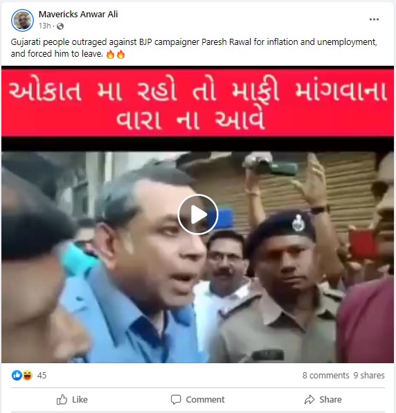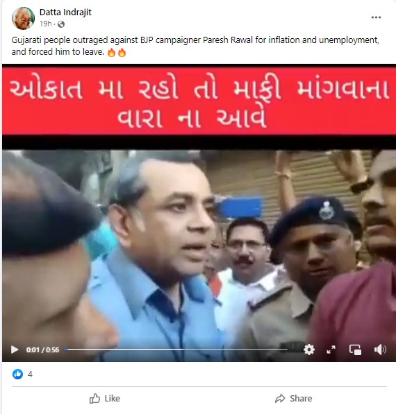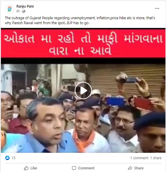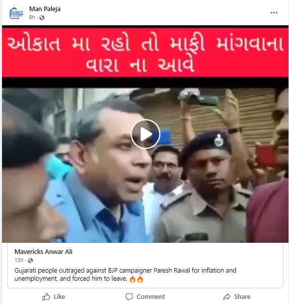 Several Facebook users shared footage, claiming “Gujarati people outraged against BJP campaigner Paresh Rawal for inflation and unemployment, and forced him to leave.”