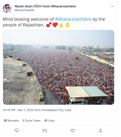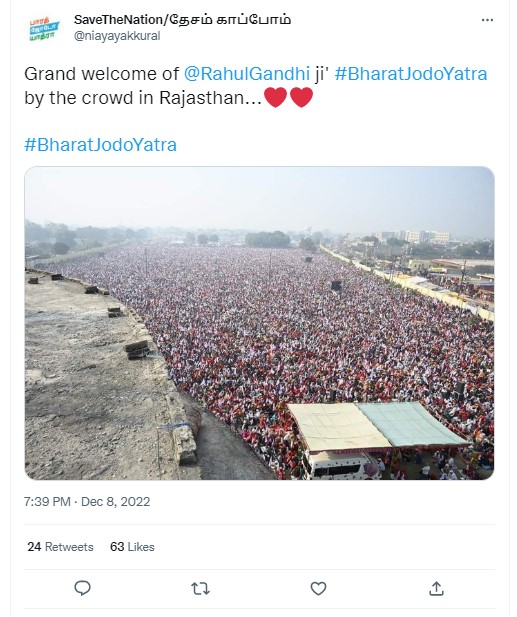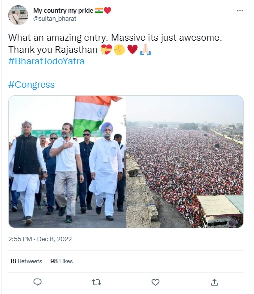 Several Twitter users shared the photo claiming to show the “Grand Welcome” given to Rahul Gandhi’s Bharat Jodo Yatra in Rajasthan.