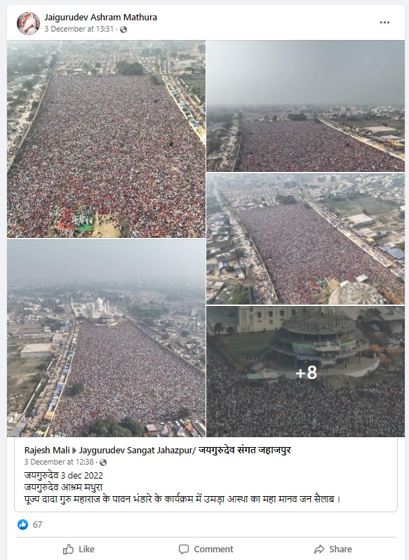 The post featured over 45 photos from a program at Jaigurudev Ashram in Mathura, including the photo widely shared to show the crowd at Bharat Jodo Yatra in Rajasthan.