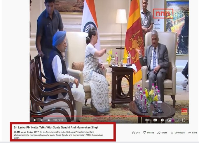 A Sri Lankan flag can be seen alongside the Indian tricolor in the viral video. Taking a clue, we conducted a keyword search for “Sonia Gandhi, Manmohan Singh,” and “Sri Lankan dignitaries” on Google which led us to a YouTube video by NNIS – News, dated April 26, 2017, titled ‘Sri Lanka PM Holds Talks With Sonia Gandhi And Manmohan Singh.’ On comparing the keyframes of the viral clip with the video by NNIS – News, we could conclude that both the visuals show the same event.