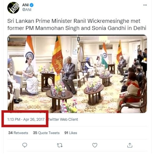 Further, we looked up the keywords “Sonia Gandhi, “Manmohan Singh,” and “Ranil Wickremesinghe” on Google and set the time frame of the search from April 1, 2017, to April 30, 2017, which yielded a tweet by news agency ANI, dated April 26, 2017. The post carried two photographs from the aforementioned meeting between the then Sri Lankan PM Ranil Wickremesinghe and former PM Manmohan Singh and Sonia Gandhi. An archived version of the same can be seen here.