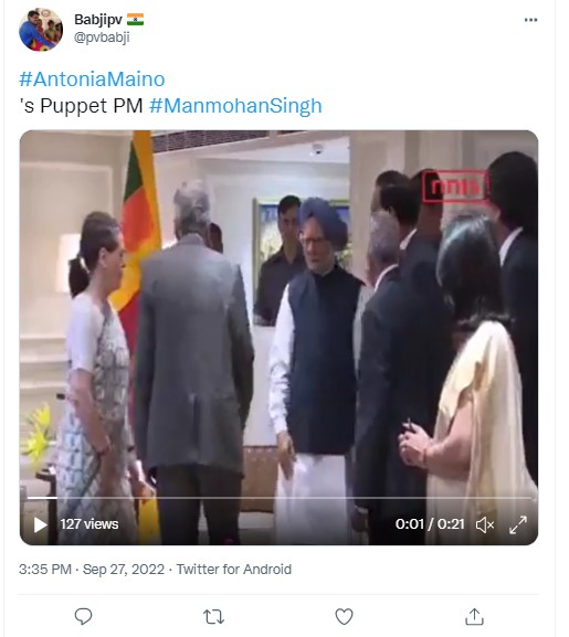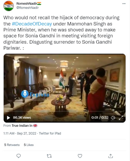 Twitter user @BattaKashmiri shared the video captioned “Those who believe that Manmohan Singh was the Prime Minister of India for 10 years must watch this 30 seconds video four times…!” The post, dated September 28, 2022, has garnered over 4.9k retweets, 14K likes and has been viewed around 169K times so far.