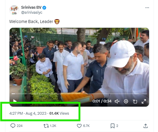 A Google lens search on the keyframes of the viral video led us to an X post by Srinivas BV, the National President of Indian Youth Congress, dated August 4, 2023. The post featured the widely circulated footage of Rahul Gandhi, and stated “Welcome Back, Leader”.