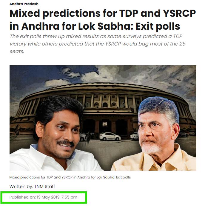 Following this, we looked up the viral graphic on Google lens, and found a report by The News Minute, dated 19 May 2019. Displaying a similar graphic, the report detailed the results of exit polls for the Andhra Lok Sabha Elections 2019. It stated, “The exit polls for the Andhra Pradesh Lok Sabha Elections are out and it seems to be a close fight for 25 MP seats in the state between the ruling Telugu Desam Party (TDP) and the opposition YSRCP.”