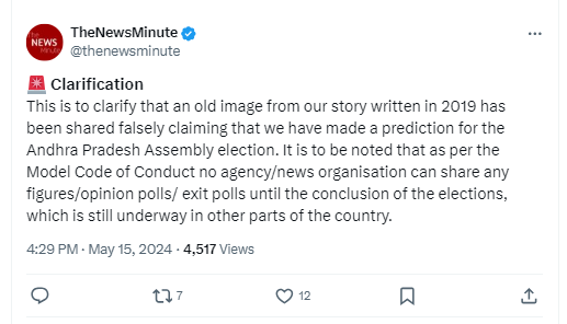 Further, we found an X post by The News Minute, dated May 15, 2024, calling out the viral graphic. It stated, “This is to clarify that an old image from our story written in 2019 has been shared falsely claiming that we have made a prediction for the Andhra Pradesh Assembly election. It is to be noted that as per the Model Code of Conduct no agency/news organisation can share any figures/opinion polls/ exit polls until the conclusion of the elections, which is still underway in other parts of the country.”