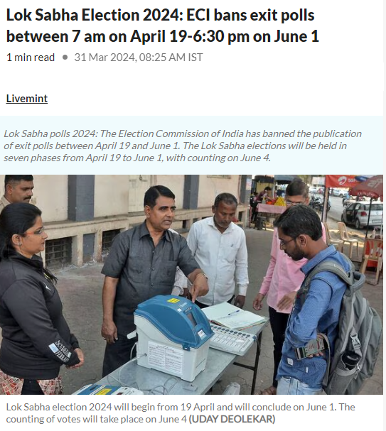 Notably, the prevalent rules prohibit the release of exit polls before the completion of the elections. For the ongoing elections, the ECI has imposed a ban on the publication or publicising of exit polls between 7 am on April 19 and 6:30 pm on June 1.