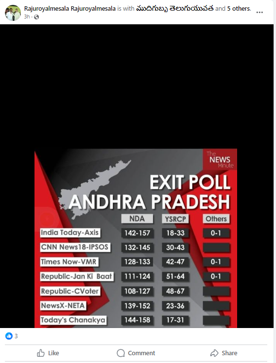 An alleged graphic by The News Minute showing exit polls predicting a clean sweep for the NDA in Andhra Pradesh assembly elections is going viral on social media platforms. The graphic features the purported exit poll data by multiple outlets, such as India Today-Axis, CNN News18-IPSOS, Times Now-VMR, Republic-Jan Ki Baat, Republic-CVoter, NewsX-NETA, and Today’s Chanakya, foreseeing a clear majority for the NDA in the state elections. Newschecker found that the viral graphic has been digitally manipulated.