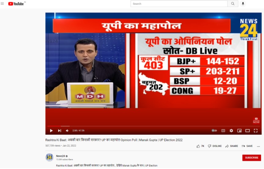 Newschecker conducted a Google reverse image search on the viral graphic to ascertain its authenticity and found a video report uploaded by news channel ‘News24’ on its official YouTube channel on January 22, 2022. The video showed the results of the opinion poll surveys undertaken by different organisations in Uttar Pradesh.