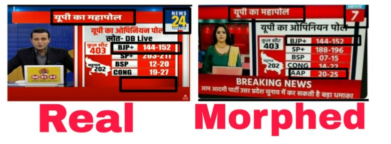 The viral graphic claiming to show an opinion poll by News7 projecting massive edge to the SP in upcoming UP polls has been morphed. The viral graphic has been manipulated and made by combining elements of three different news channels.