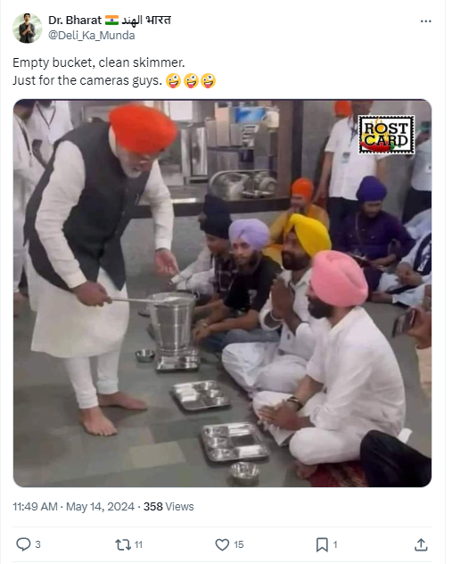 A photograph of Prime Minister Narendra Modi holding a steel vessel, and a ladle serving devotees at a Gurudwara, is being widely shared on social media platforms. Those sharing the image claim that the Prime Minister was just imitating the act of serving as both the bucket as well as the ladle were empty. Newschecker found the claim to be untrue. A video of the same shows PM Modi serving langar to devotees at Gurudwara Patna Sahib.