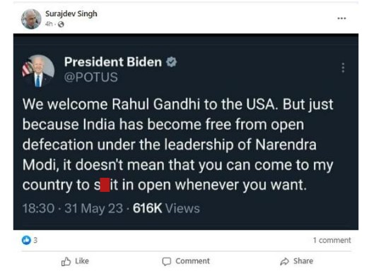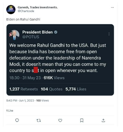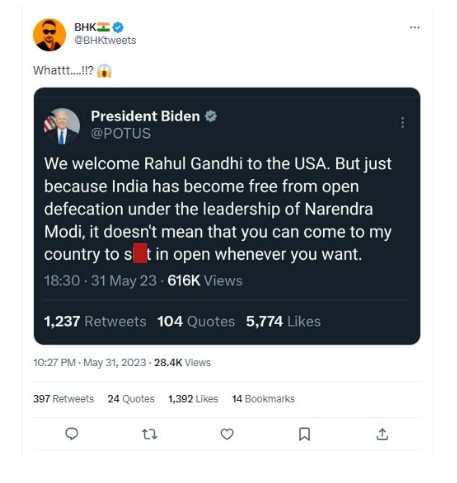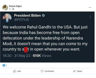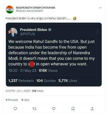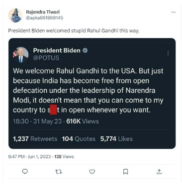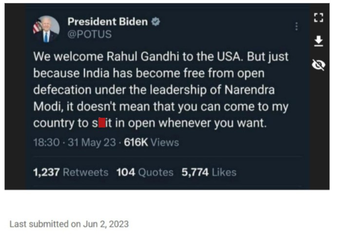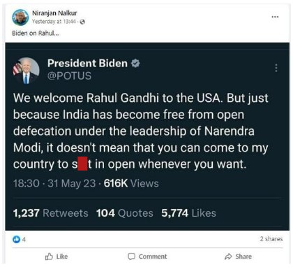 An alleged screengrab of a tweet showing US President Joe Biden’s jeering remarks on Rahul Gandhi’s recent visit to the States is being widely shared on social media platforms. The alleged tweet, dated May 31, 2023, by @POTUS reads, “We welcome Rahul Gandhi to the USA. But just because India has become free from open defecation under the leadership of Narendra Modi, it doesn’t mean that you can come to my country to sh*t in open whenever you want.” Newschecker found the viral tweet to be fabricated.
