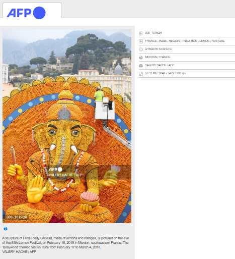 The image posted on 16th February, 2018 credited to Valery Hache of AFP has been posted on their website along with the caption ‘A sculpture of Hindu deity Ganesh, made of lemons and oranges, is pictured on the eve of the 85th Lemon Festival, on February 16, 2018 in Menton, southeastern France. The ‘Bollywood’ themed festival runs from February 17 to March 4, 2018.’