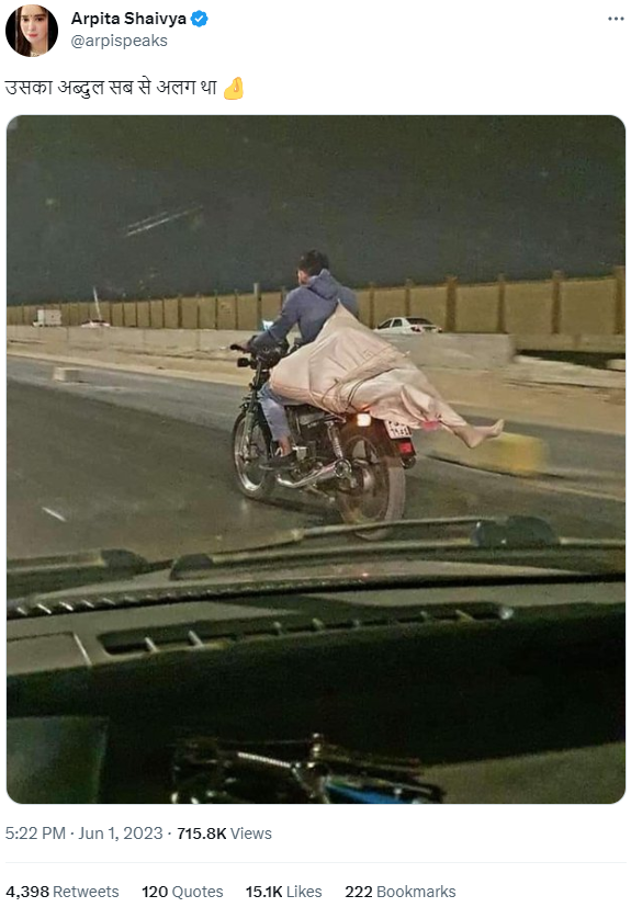 A photo showing a man riding a bike, seemingly with a corpse bound up in the pillion seat, is doing the rounds on social media. The purported corpse is packed in a rucksack, and a limb can be seen sticking out. Those sharing the image are sharing it with a communal twist, insinuating that it was a case of ‘love jihad’.