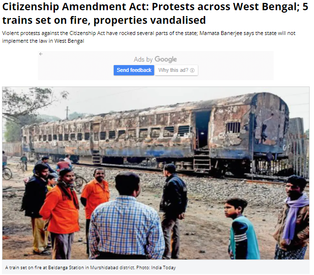 According to the report “Sporadic incidents of violence were reported from several districts of West Bengal on Sunday as people protested against the Citizenship Amendment Act. Protestors vandalised properties at three railway stations and set five trains on fire in the state.”