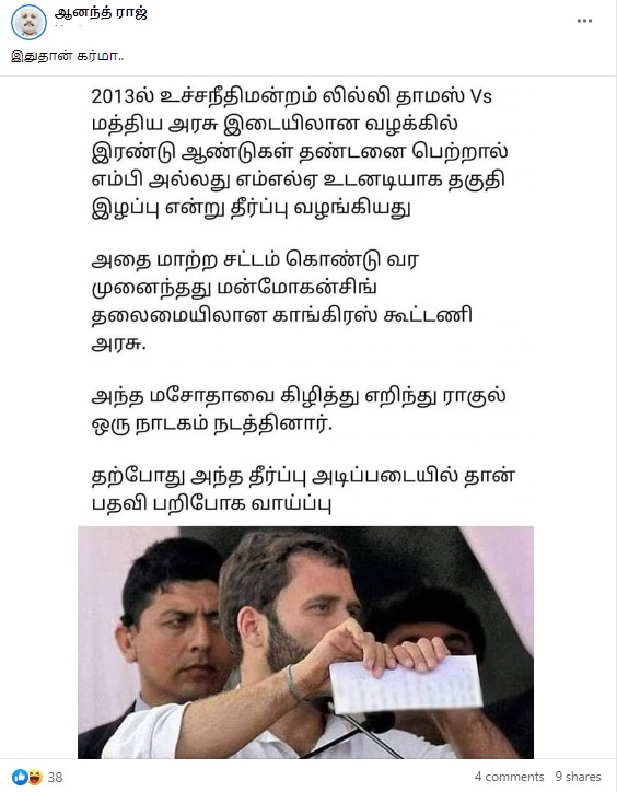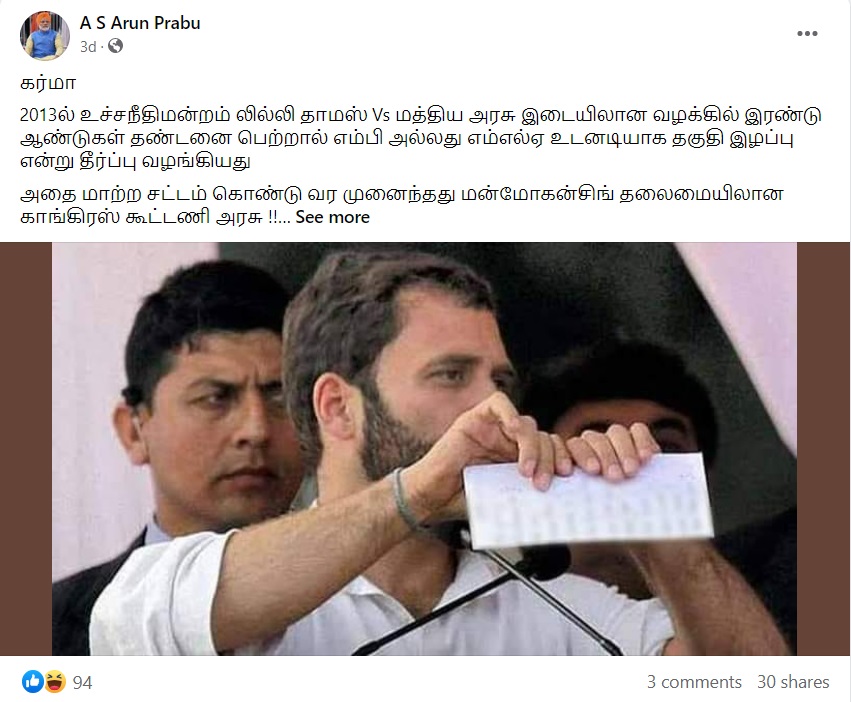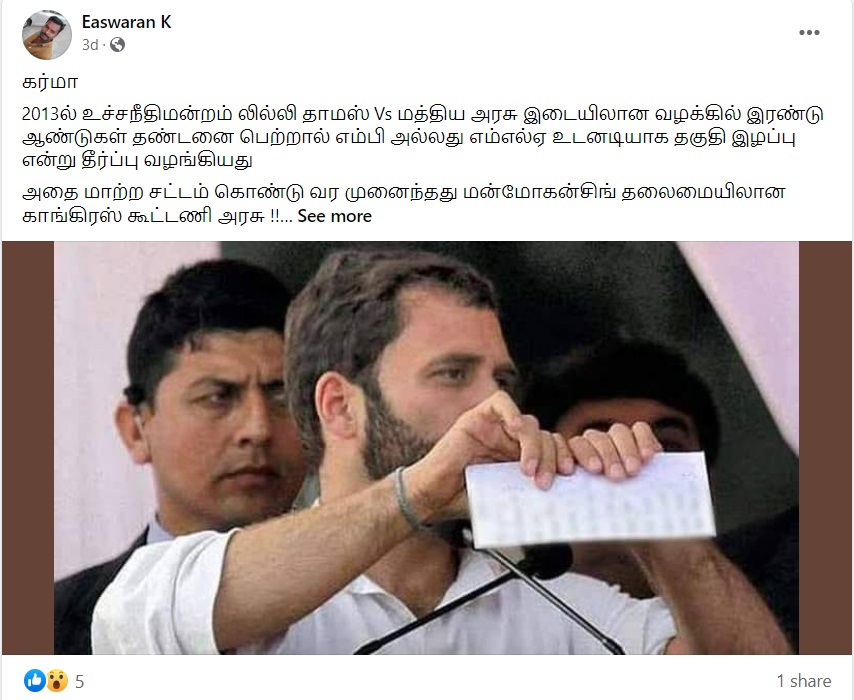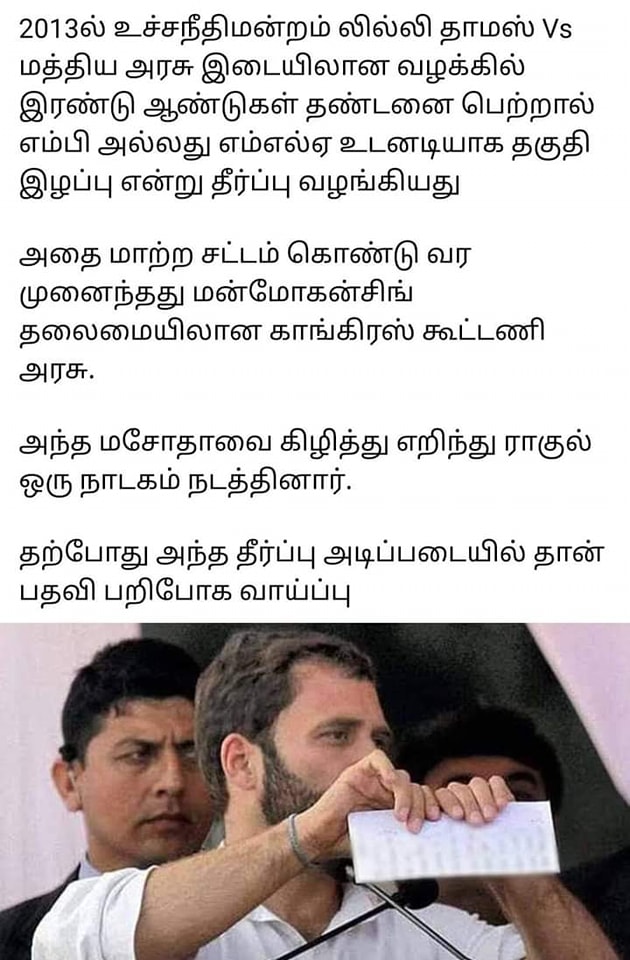 ”2013ல் உச்சநீதிமன்றம் லில்லி தாமஸ் Vs மத்திய அரசு இடையிலான வழக்கில் இரண்டு ஆண்டுகள் தண்டனை பெற்றால் எம்பி அல்லது எம்எல்ஏ உடனடியாக தகுதி இழப்பு என்று தீர்ப்பு வழங்கியது. அதை மாற்ற சட்டம் கொண்டு வர முனைந்தது மன்மோகன்சிங் தலைமையிலான காங்கிரஸ் கூட்டணி அரசு. அந்த மசோதாவை கிழித்து எறிந்து ராகுல் ஒரு நாடகம் நடத்தினார். தற்போது அந்த தீர்ப்பு அடிப்படையில் தான் பதவி பறிபோக வாய்ப்பு” என்பதாக இந்த புகைப்படச்செய்தி பரவி வருகிறது.