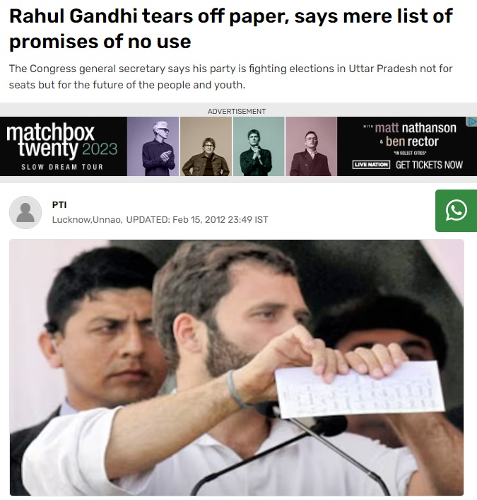தொடர்ந்து, வைரல் பதிவில் இடம்பெற்றிருக்கும் புகைப்படத்தை நாம் ரிவர்ஸ் இமேஜ் சர்ச் முறைக்கு உள்ளாக்கியபோது, கடந்த 2012ஆம் ஆண்டு NDTV வெளியிட்டிருந்த வீடியோ ஒன்று நமக்குக் கிடைத்தது. “In Dramatic Flourish, Rahul Gandhi rips up paper at Rally” என்கிற தலைப்பில் இடம்பெற்றிருந்த வீடியோவில் வைரலாகும் புகைப்படத்தில் அவர் பேப்பர் ஒன்றை கிழிக்கும் காட்சி இடம்பெற்றுள்ளது.