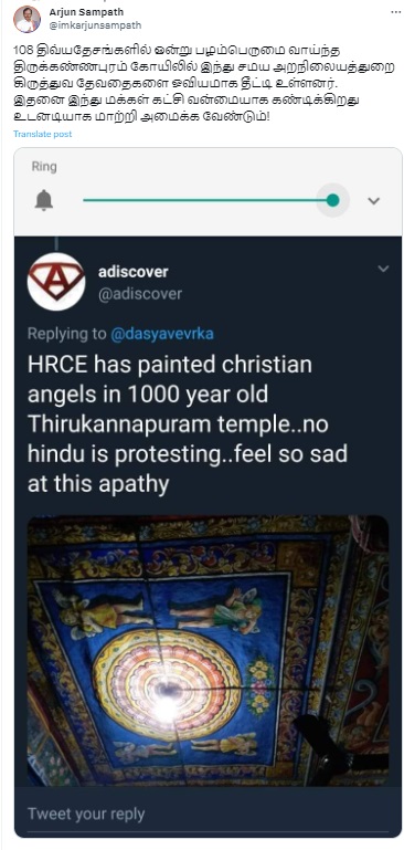 திருக்கண்ணபுரம் கோயிலில் இந்து சமய அறநிலையத்துறை கிருத்துவ தேவதைகளை ஓவியமாக தீட்டி உள்ளனர். இதனை இந்து மக்கள் கட்சி வன்மையாக கண்டிக்கிறது உடனடியாக மாற்றி அமைக்க வேண்டும்!” என்று இந்த புகைப்படத்தை பகிர்ந்து கண்டனம் தெரிவித்துள்ளார்.