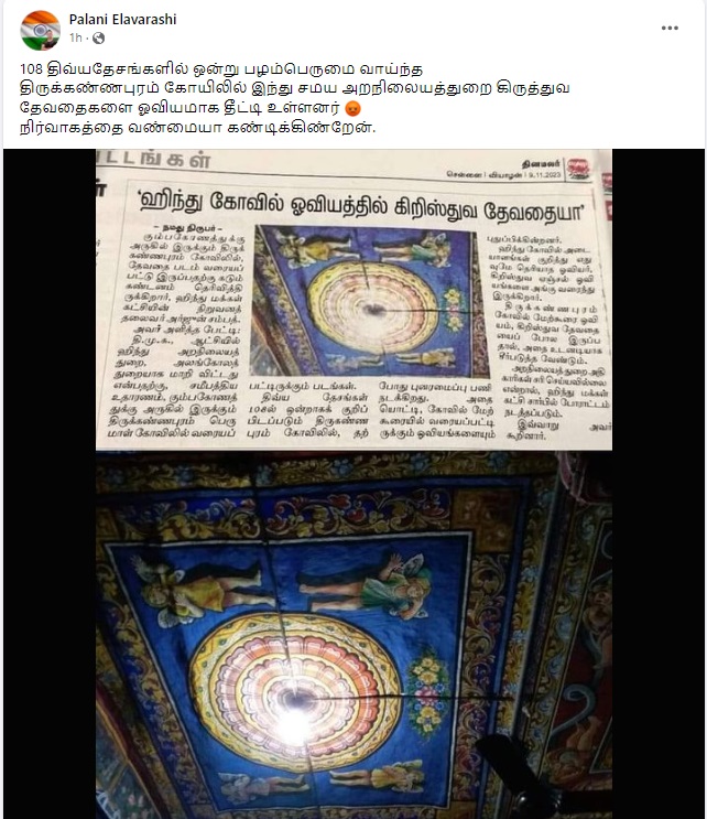 திமுக ஆட்சியில் அறநிலையத்துறையால் திருக்கண்ணபுரம் பெருமாள் கோவிலில் கிறிஸ்துவ தேவதைகள் ஓவியங்களாக வரையப்பட்டுள்ளதாகப் பரவும் புகைப்படம் குறித்த உண்மையறிய அதுபற்றிய ஆய்வில் ஈடுபட்டோம்.