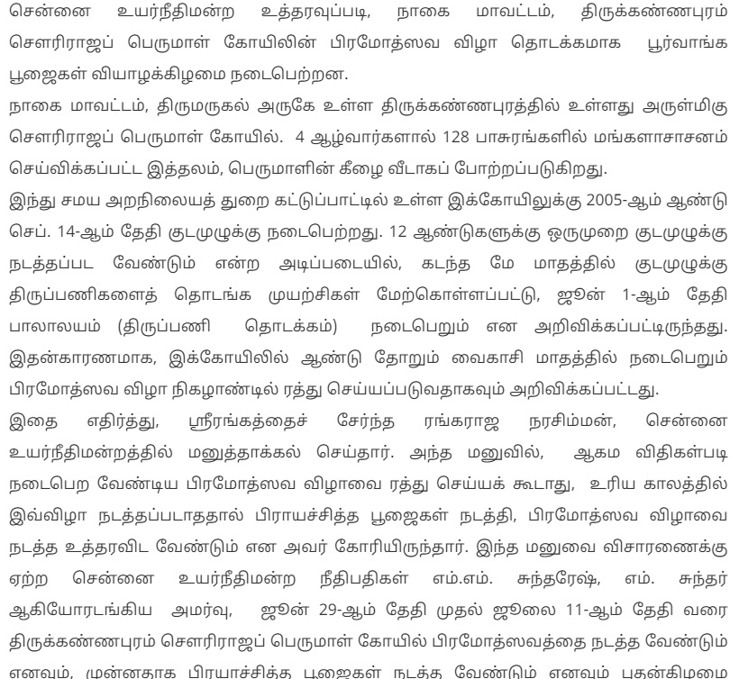 தொடர்ந்து, கடந்த ஜூன் 16, 2018 அன்று நக்கீரன் வெளியிட்டுள்ள “கோயில் கும்பாபிஷேகம் நடத்த அரசு அனுமதி தருமா? சட்டப்பேரவையில் தமிமுன் அன்சாரி கேள்வி” என்கிற செய்தியில் திருக்கண்ணப்புரம் செளரிராஜப் பெருமாள் கோவிலுக்கு இந்த ஆண்டு கும்பாபிஷேகம் நடத்தப்படுமா? என்று கேள்வி எழுப்பியிருந்தார் எனக் கூறப்பட்டுள்ளது.