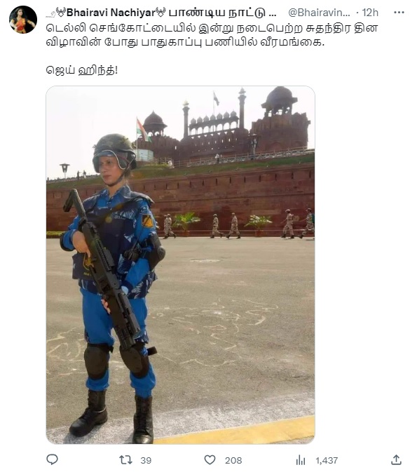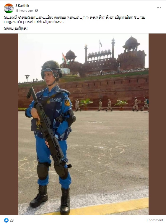 ”டெல்லி செங்கோட்டையில் இன்று நடைபெற்ற சுதந்திர தின விழாவின் போது பாதுகாப்பு பணியில் வீரமங்கை.” என்று இந்த புகைப்படம் பரவி வருகிறது.