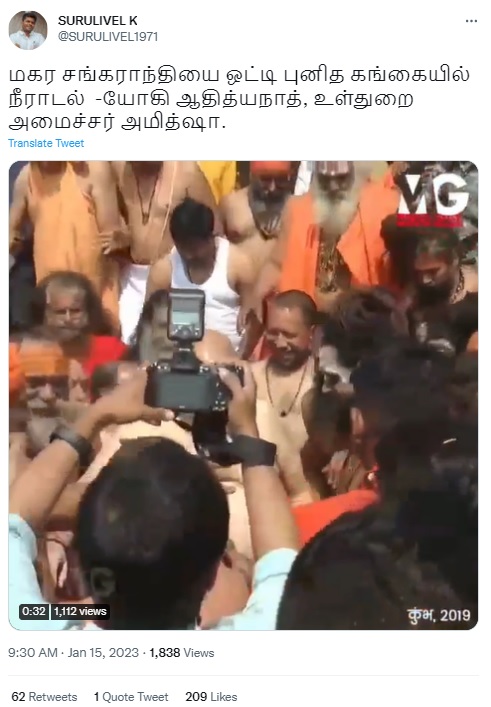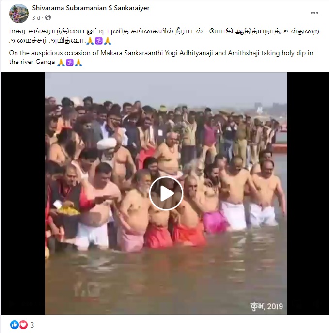 ”மகர சங்கராந்தியை ஒட்டி புனித கங்கையில் நீராடல் -யோகி ஆதித்யநாத், உள்துறை அமைச்சர் அமித்ஷா.” என்கிற தலைப்புடன் அந்த வீடியோ பதிவு பரவி வருகிறது.