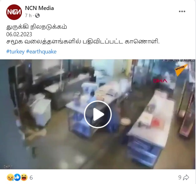 துருக்கியில் 7.8 ரிக்டர் அளவில் பதிவான பயங்கர நிலநடுக்கத்தினால் கட்டிடங்கள் இடிந்து விழுந்தன. அதிகாலையில் ஏற்பட்ட நிலநடுக்கம் என்பதால் இடிபாடுகளுக்குள் சிக்கி ஆயிரக்கணக்காணோர் உயிரிழுந்துள்ளதாக செய்திகள் தெரிவிக்கின்றன. இந்நிலையில், துருக்கி நிலநடுக்க காணொளி என்பதாக பல்வேறு வீடியோக்கள் சமூக வலைத்தளங்களில் பரவி வருகின்றன. அதில், உணவகத்திற்குள் துருக்கி நிலநடுக்க காட்சி என்று வீடியோ ஒன்று பரவுகிறது.