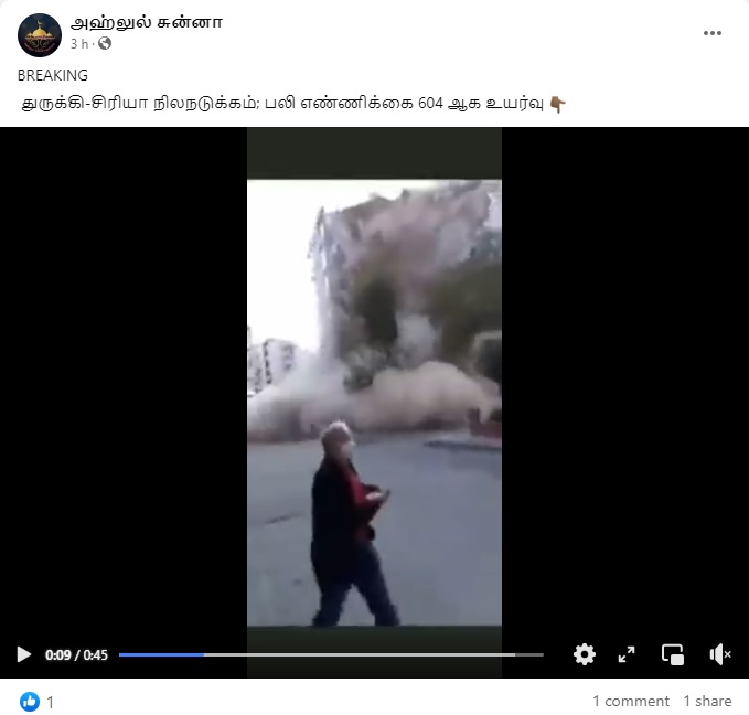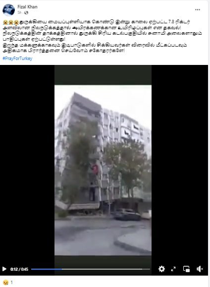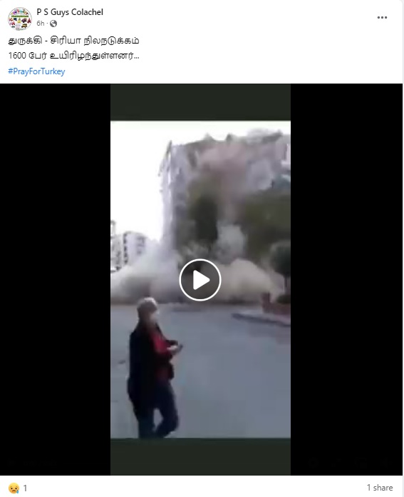 இந்நிலையில், துருக்கி நிலநடுக்க காணொளி என்பதாக பல்வேறு வீடியோக்கள் சமூக வலைத்தளங்களில் பரவி வருகின்றன. அதில், “துருக்கி நிலநடுக்கம்” என்பதாக வீடியோ ஒன்று பரவுகிறது.