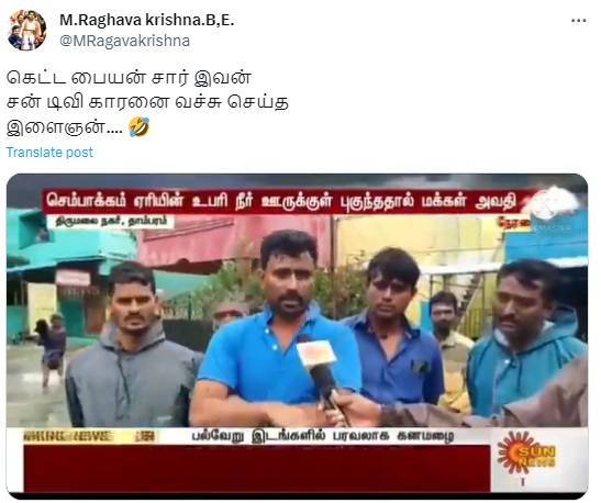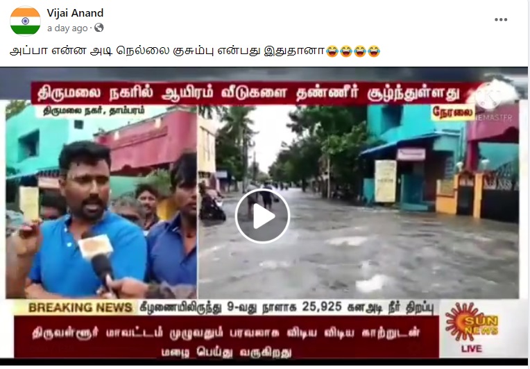 நெல்லை இளைஞர் ஒருவர் சென்னை வெள்ளத்தை நையாண்டி செய்து பேசியதாகப் பரவும் வீடியோ குறித்த உண்மையறிய அதுபற்றிய ஆய்வில் ஈடுபட்டோம்.