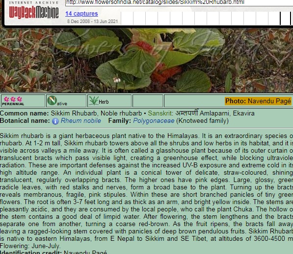 தொடர்ந்து, குறிப்பிட்ட புகைப்படத்தை ரிவர்ஸ் சர்ச் முறைக்கு உள்ளாக்கியபோது புகைப்படத்தில் இருக்கும் மலரின் உண்மையான தாவரவியல் பெயர் Rheum nobile என்பது நமக்குத் தெரியவந்தது. இமயமலைப் பகுதியில் வளரக்கூடிய மிகப்பெரிய தாவர வகையைச் சேர்ந்தது. நேபாளம், சிக்கிம், பூட்டான், திபெத் ஆகிய மலைத்தொடர்களில் 4000 மீட்டர் உயரத்தில் வளரக்கூடிய தாவரம் இது.
