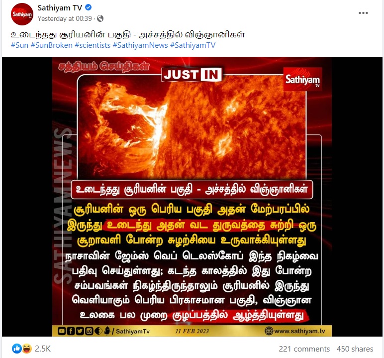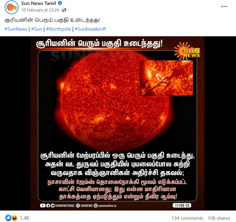 சூரியனின் ஒரு பகுதி உடைந்ததை ஜேம்ஸ் வெப் தொலைநோக்கி படமெடுத்ததாக செய்தி சமூக வலைத்தளங்களில் பரவியதைத் தொடர்ந்து அதுகுறித்த ஆய்வில் ஈடுபட்டோம்.