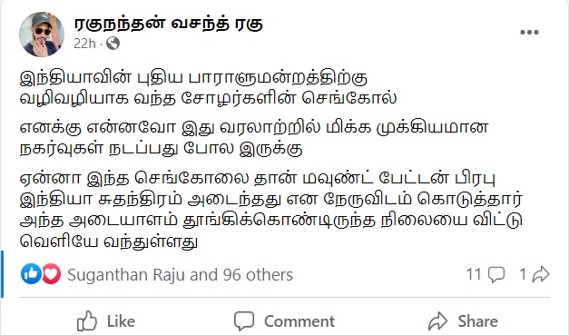 அதில், “செங்கோல் சிறப்பு.#வரலாறு_முக்கியம். பாரத சுதந்திரத்தைப் பெற்றது ஒரு தமிழர்! சுதந்திரம் பெறும் போது ஒலித்தது தமிழ்!!உச்சந்தலை முதல் உள்ளங்கால் வரை புதிய இரத்தத்தை பாய வைக்கும் செய்தி இது.