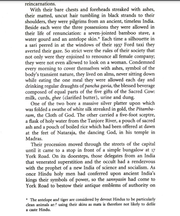 ஒரு சன்னியாசியிடம் ஐந்தடி உயரமுள்ள தங்க முலாம் பூசப்பட்ட 2 அங்குலம் கனமான செங்கோல் இருந்தது. தஞ்சாவூரிலிருந்து எடுத்து வந்த புனித நீரை நேருவின் தலையில் ஒருவர் தெளித்தார். நேருவின் நேற்றியில் விபூதி பூசப்பட்டது. நேருவுக்கு பீதாம்பரத்தைப் போர்த்தி, செங்கோலை அவர்கள் வழங்கினார்கள். அன்று காலையில் நடராஜருக்குப் படைக்கப்பட்டு, விமானத்தில் கொண்டுவரப்பட்ட பிரசாதமும் அவருக்கு வழங்கப்பட்டது,” என்பதாகத் தெரிவிக்கப்பட்டுள்ளது என்று குறிப்பிடப்பட்டுள்ளது.