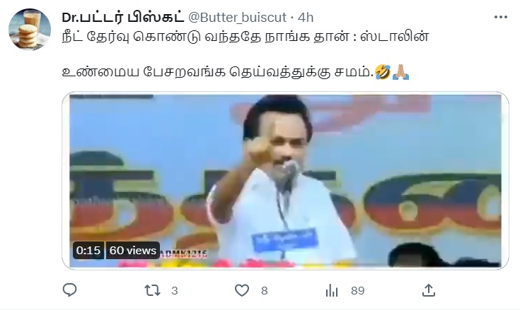 “நீட் தேர்வு கொண்டு வந்ததே நாங்க தான் : ஸ்டாலின் . உண்மைய பேசறவங்க தெய்வத்துக்கு சமம்.” என்கிற பதிவுடன் முதல்வர் மு.க.ஸ்டாலின் நீட் தேர்வு குறித்து “திராவிட முன்னேற்றக் கழகம் ஆட்சியில் இருந்தபோதுதான் மத்தியிலே இந்த நீட் தேர்வு கொண்டுவரவேண்டும் என்று முடிவெடுத்தார்கள்; மறுக்கவில்லை” என்று பேசும் சிறிய வீடியோ ஒன்று அதனுடன் பரவுகிறது.