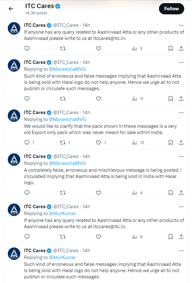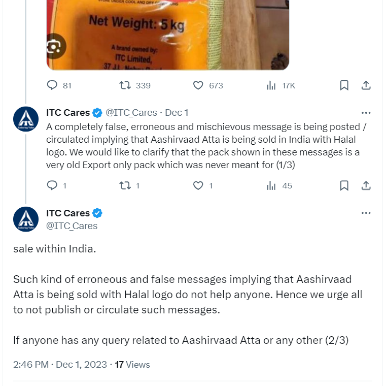 இந்தியாவில் ஆசிர்வாத் மாவு ஹலால் முத்திரையுடன் விற்பனை செய்யப்படுவதாக பரவும் தகவல் தவறானதாகும். ஹலால் முத்திரை கண்டிப்பாக கேட்கப்படும் நாடுகளுக்கு ஏற்றுமதி செய்யப்படும் பொருட்களிலேயே இந்த முத்திரையையை ஐடிசி பதித்துள்ளது. இந்த உண்மையை உரிய ஆதாரங்களுடன் விளக்கியுள்ளோம்.