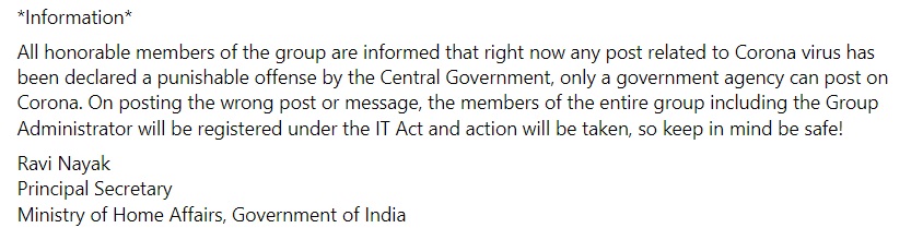 கோவிட் குறித்த செய்திகளைப் பகிரும் வாட்ஸ் அப் குழுக்கள் மீது நடவடிக்கை எடுக்கப்படும் என்று மத்திய அரசு அறிவித்துள்ளதாக தகவல் ஒன்று சமூக வலைத்தளங்களில் பரவி வருகின்றது.