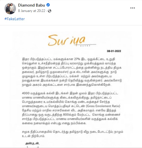 எனவே, நடிகர் சூர்யா பெயரில் பரவுகின்ற குறிப்பிட்ட அறிக்கை போலியானது என்பது உறுதியாகிறது.