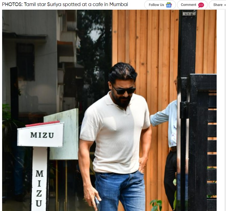 “South hero Suriya At The Mizu Restaurant In Bandra” என்று இந்த புகைப்படம் இடம்பெற்றுள்ள முழு வீடியோ Movified யூடியூப் பக்கத்தில் வெளியாகியுள்ளது. அதில், சூர்யா Mizu உணவகத்தில் இருந்து வெளிவரும் காட்சி முழுவதுமாக இடம்பெற்றுள்ளது.