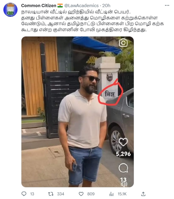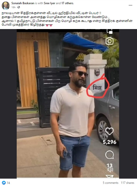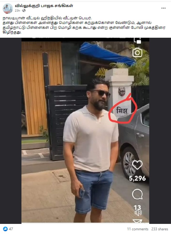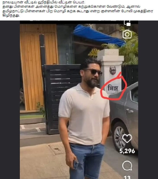”நாலடியான் வீட்டில் ஹிந்தியில் வீட்டின் பெயர். தனது பிள்ளைகள் அனைத்து மொழிகளை கற்றுக்கொள்ள வேண்டும், ஆனால் தமிழ்நாட்டு பிள்ளைகள் பிற மொழி கற்க கூடாது என்ற குள்ளனின் போலி முகத்திரை கிழிந்தது.” என்பதாக இந்த புகைப்படச்செய்தி பரவி வருகிறது.