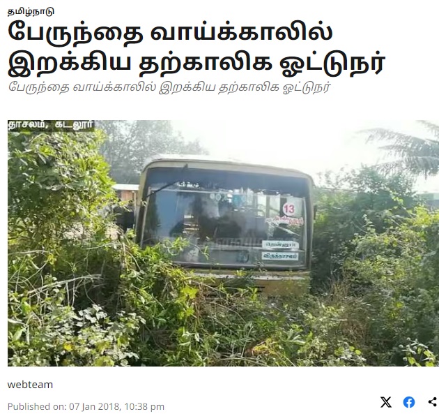தமிழகத்தில் தற்காலிக ஓட்டுநர்கள் செலுத்திய பேருந்துகளின் நிலை என்று, தமிழ்நாடு அரசு போக்குவரத் துறை ஊழியர்களின் வேலை நிறுத்தப் போராட்டம் நடைபெற்று வருகின்ற நிலையில் பல்வேறு புகைப்படங்கள் பரவி வருகின்றன.