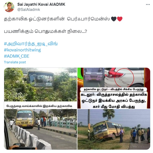 தமிழகத்தின் பல்வேறு மாவட்டங்களில் தற்காலிக ஓட்டுநர்கள் ஓட்டிய பேருந்துகள் விபத்து உள்ளிட்ட நிகழ்வுகளில் சிக்கிய நிலையில் இந்த புகைப்படங்களை பலரும் பரப்பி வருகின்றனர்.