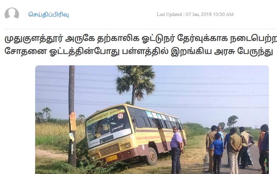 “முதுகுளத்தூர் அருகே தற்காலிக ஓட்டுநர் தேர்வுக்காக நடைபெற்ற சோதனை ஓட்டத்தின்போது பள்ளத்தில் இறங்கிய அரசு பேருந்து” என்கிற தலைப்பிலான செய்தியில் இப்புகைப்படம் இடம்பெற்றிருந்தது.