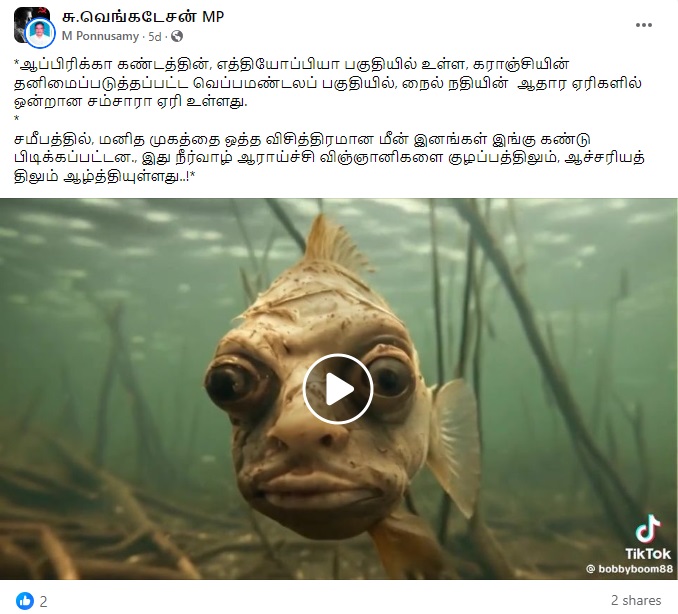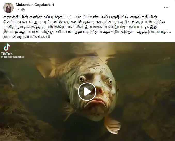 “கராஞ்சியின் தனிமைப்படுத்தப்பட்ட வெப்பமண்டலப் பகுதியில் நைல் நதியின் வெப்பமண்டல ஆதாரங்களின் ஏரிகளில் ஒன்றான சம்சாரா ஏரி உள்ளது. சமீபத்தில், மனித முகத்தை ஒத்த விசித்திரமான மீன்கள் கண்டுபிடிக்கப்பட்டது!இது நீர்வாழ் ஆராய்ச்சி விஞ்ஞானிகளை குழப்பத்திலும், ஆச்சரியத்திலும் ஆழ்த்தியுள்ளது” என்று இந்த வீடியோ சமூக வலைத்தளங்களில் பரவுகிறது.