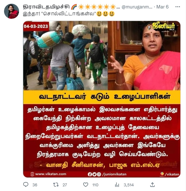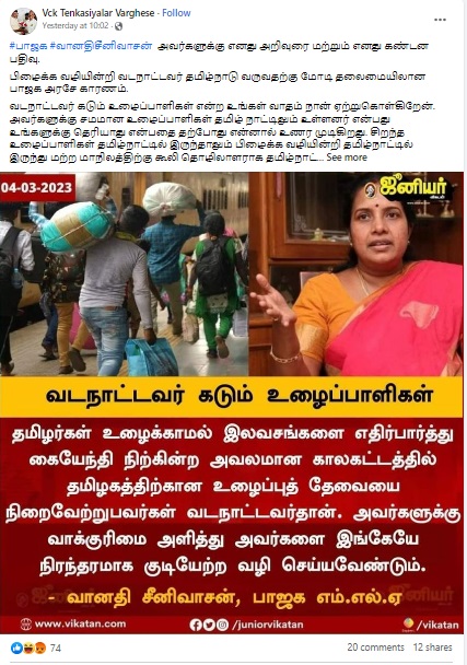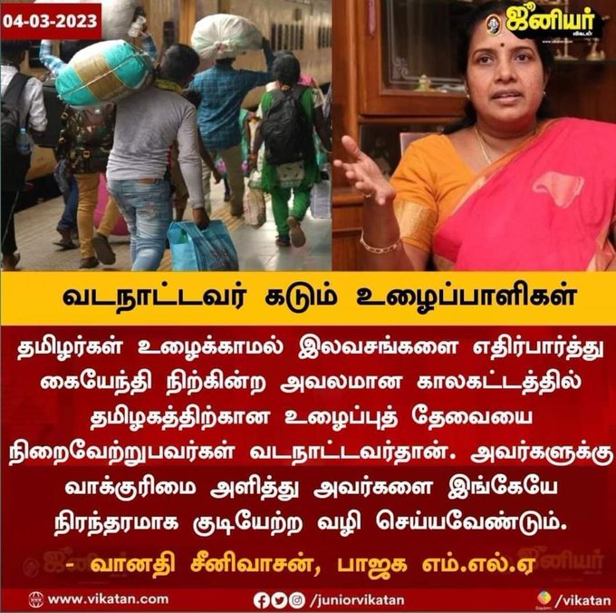 “வடநாட்டவர் கடும் உழைப்பாளிகள். தமிழர்கள் உழைக்காமல் இலவசங்களை எதிர்பார்த்து கையேந்தி நிற்கின்ற அவலமான காலகட்டத்தில் தமிழகத்திற்கான உழைப்புத் தேவையை நிறைவேற்றுபவர்கள் வடநாட்டவர்தான். அவர்களுக்கு வாக்குரிமை அளித்து அவர்களை இங்கேயே நிரந்தரமாக குடியேற்ற வழி செய்யவேண்டும்” என்று பாஜக எம்.எல்.ஏ வானதி சீனிவாசன் கூறியதாக நியூஸ்கார்ட் ஒன்று சமூக வலைத்தளங்களில் பரவி வருகிறது.