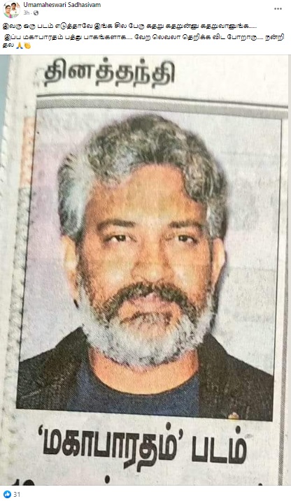 ” சும்மா மெரட்ட போறாப்ள…. இனி கதறல் சத்தம் காதை கிழிக்கும். திரைப்பட உலகின் ராஜகுரு டைரக்டர் ராஜமௌலி சார்… தலை வணங்குகிறேன்” என்றும், “இவரு ஒரு படம் எடுத்தாவே இங்க சில பேரு கதறு கதறுன்னு கதறுவானுங்க. இப்ப மகாபாரதம் பத்து பாகங்களாக….. வேற லெவலா தெறிக்க விட போறாரு….. நன்றி தல” என்பதாகவும் பலரும் இச்செய்தியை பகிர்ந்து வருகின்றனர்.